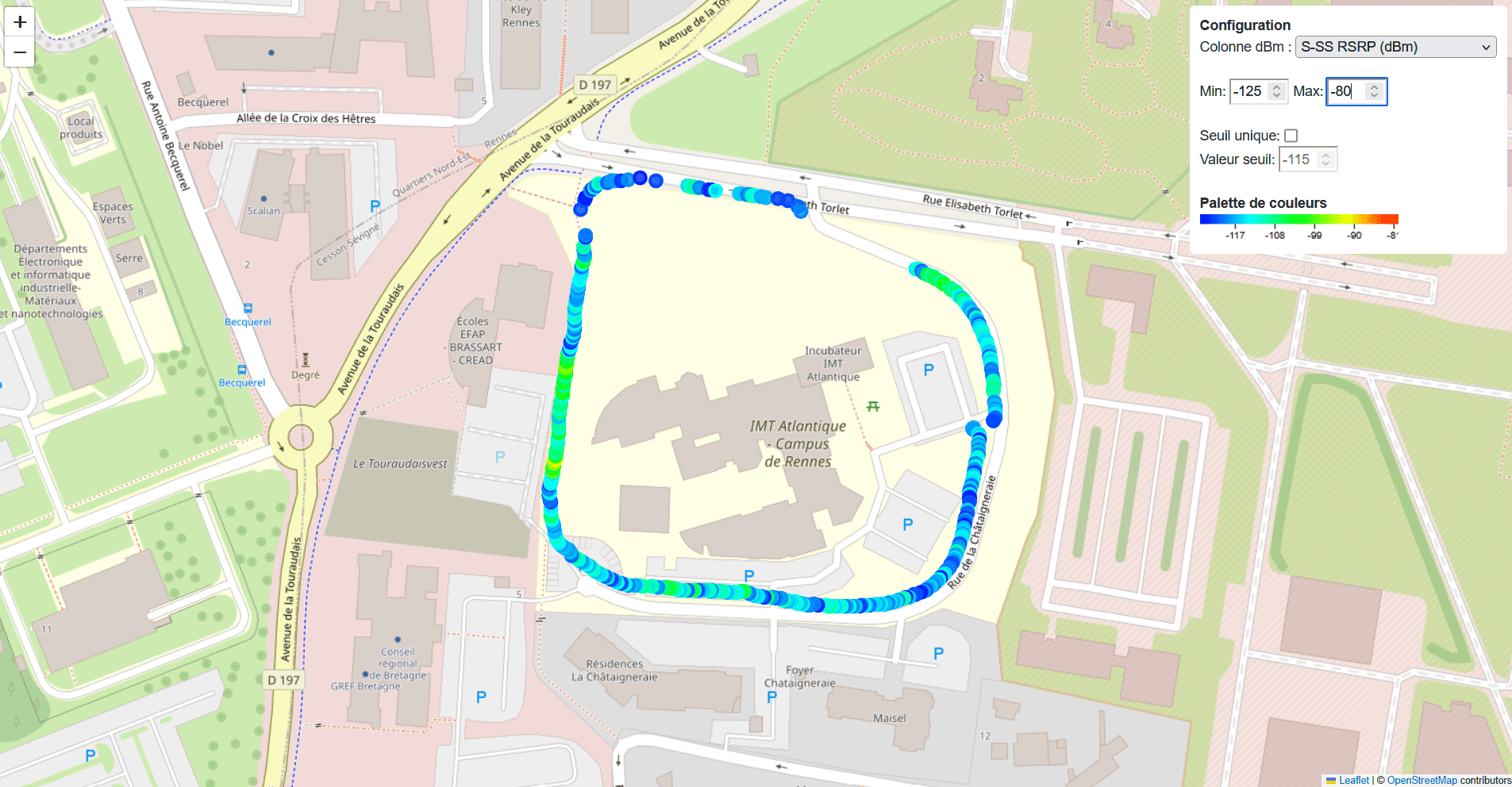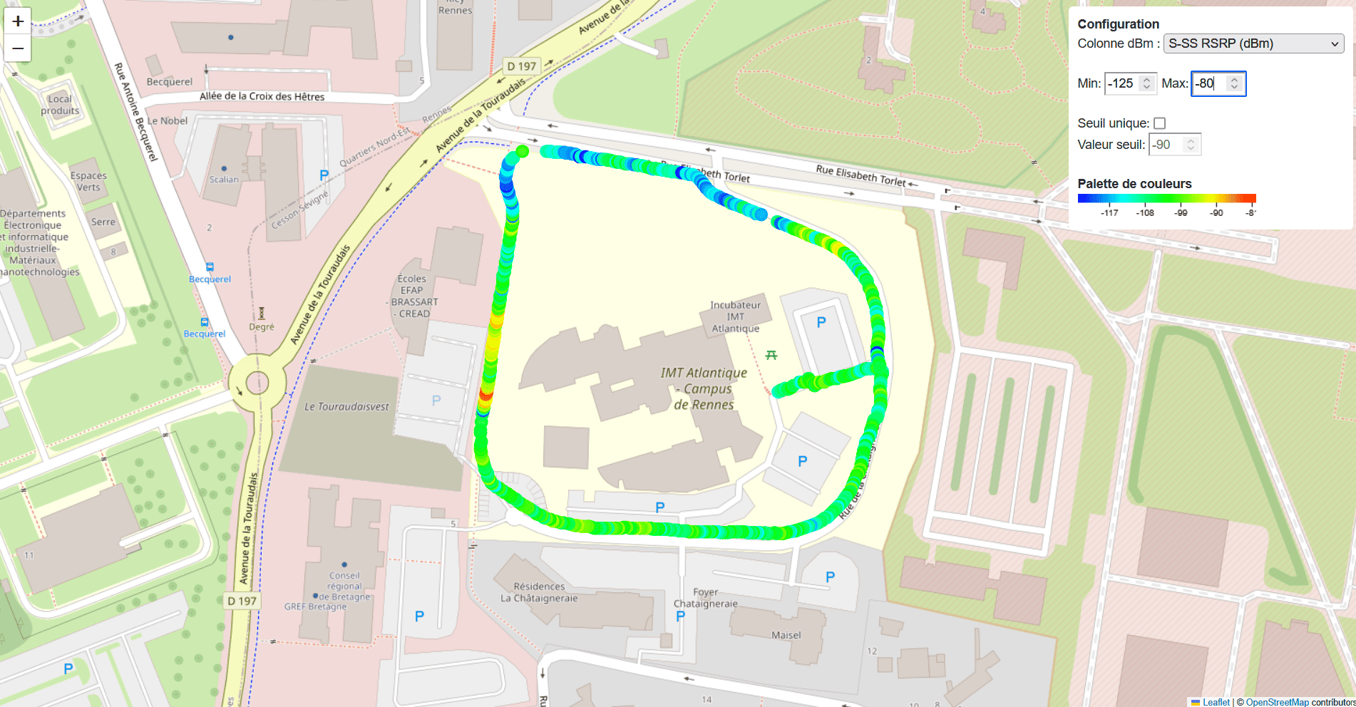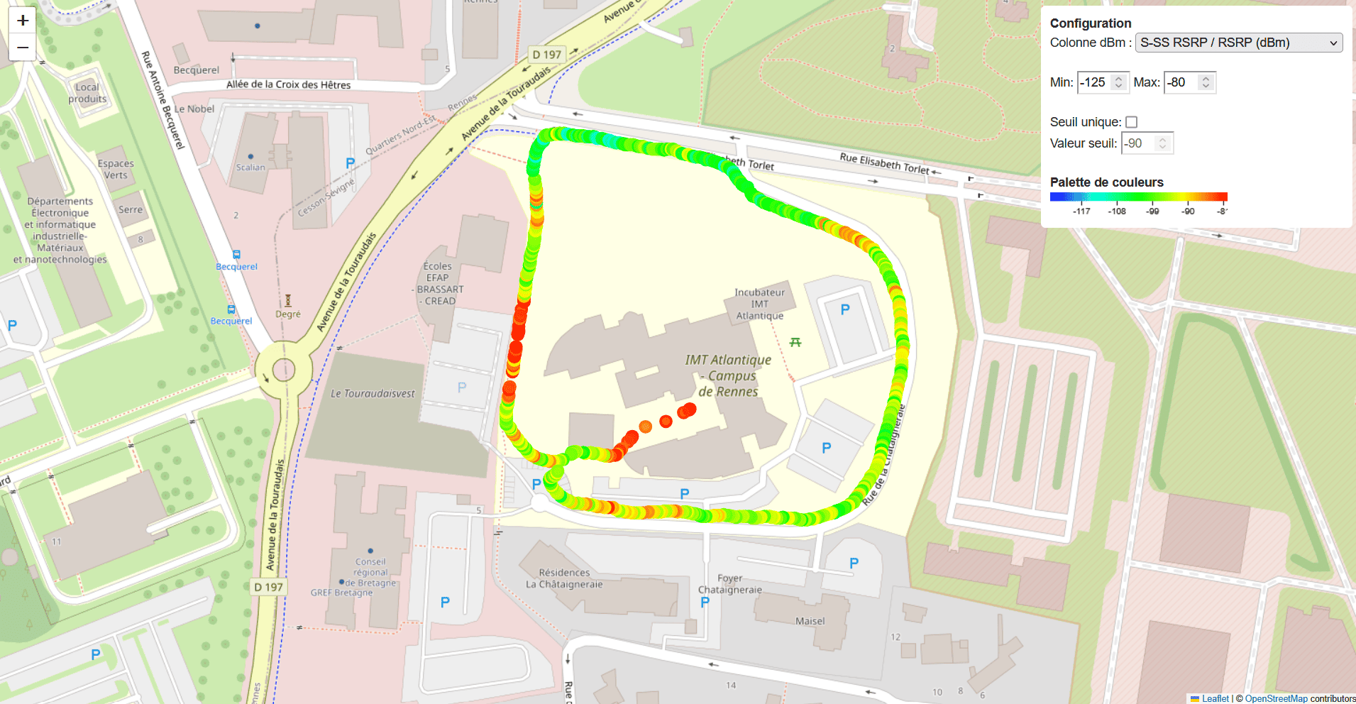 Après avoir récupéré et configuré l'analyseur de spectre Viavi, nous avons pris des mesures en marchant le long de la zone autorisée par l'ARCEP.
